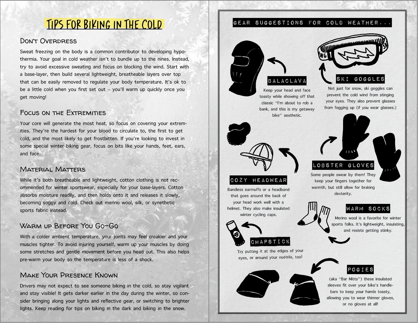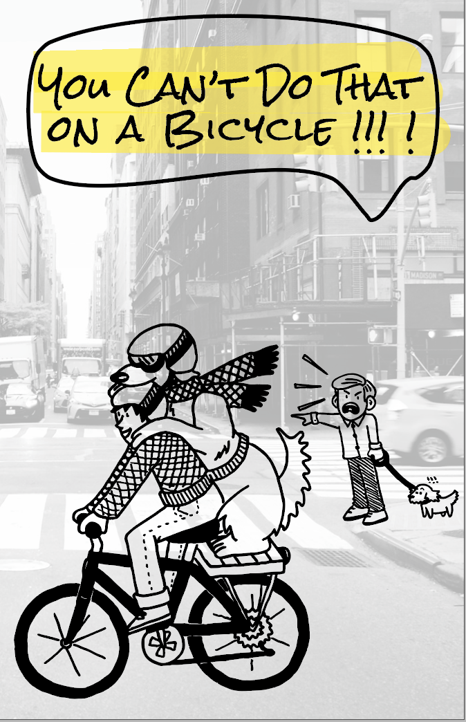 “You Can’t Do That on a Bicycle!” is an original zine (a DIY self-published book) created for a digital typography and self-publishing class. The finished product will be available for purchase at stores such as Quimby’s Books, Chicago Comics, and Alley Cat Comics.
