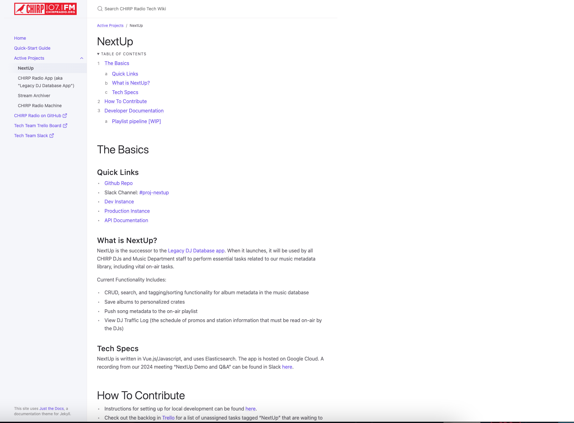 CHIRP is a volunteer-run non-profit radio station in Chicago. Like any organization that runs on volunteer power, CHIRP’s Tech Department has high turnover and work rarely gets documented; this creates barriers to entry for newcomers. I took on this project with the goal of creating a home base for everything related to the CHIRP Tech Department, making it easier for people of all skill levels to get involved. The wiki is a living document currently available to the public in its entirety at chirpradio.github.io.