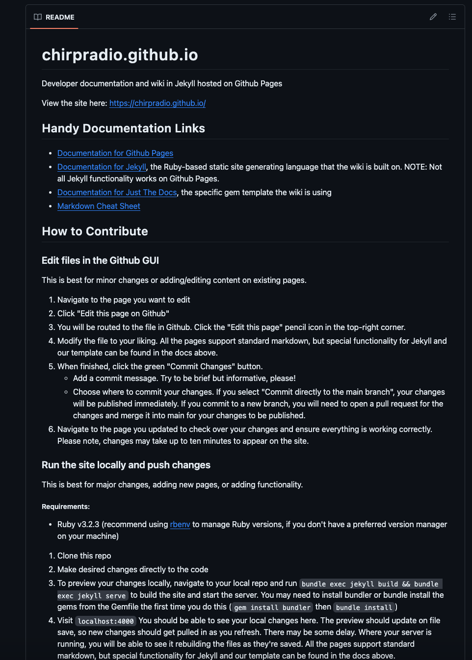 CHIRP has a Github organization where a lot of existing documentation was already located, so I ultimately chose Github pages as the wiki’s home. Github pages is free, can be as simple or as complex as necessary, and has the option of GUI editing via the website for those who are less technically inclined. It also allowed us to take a “docs-as-code” approach, allowing for robust version control and an audit trail.